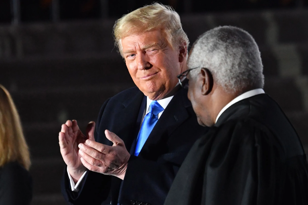 "Trump points at Clarence Thomas in explosive courtroom moment."