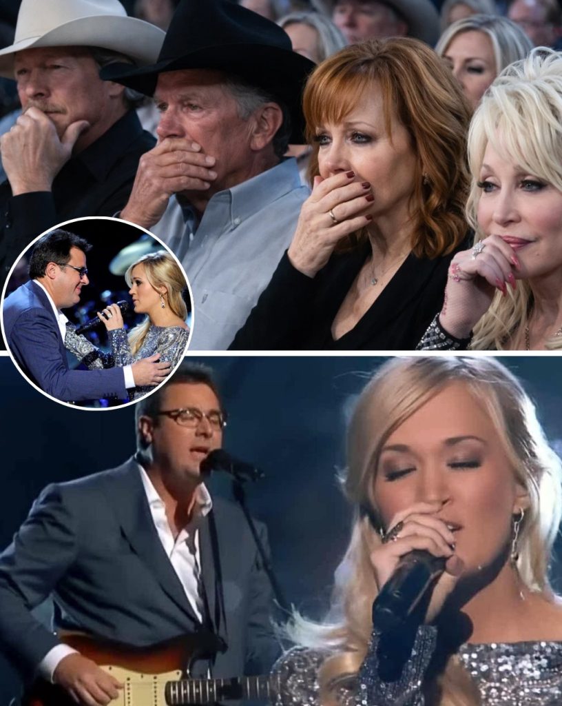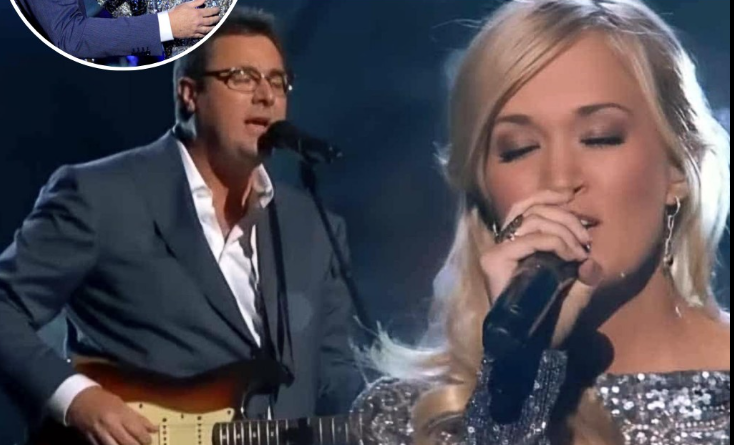 Beside her, Vince Gill embodied a different form of musical leadership. Known as much for his humility as for his virtuosity, Vince didn't step forward to assert dominance in the duet. He became a quiet anchor, a stabilizing presence that guided the narrative without ever demanding attention. His fingers moved with practiced elegance over his guitar strings, his harmonies a gentle thread weaving Carrie's emotive lines into a tapestry of shared understanding. He was there not to shine but to illuminate, to provide a foundation for Carrie's interpretation, and to allow the room itself to feel every subtle contour of the song.